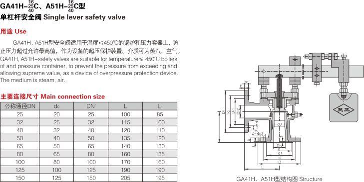 GA41H、A51H型安全閥適用于溫度≤450°C的鍋爐和壓力容器上,防止壓力超過允許z高值,作為設備的超壓保護裝置。介質可為蒸汽、空氣。